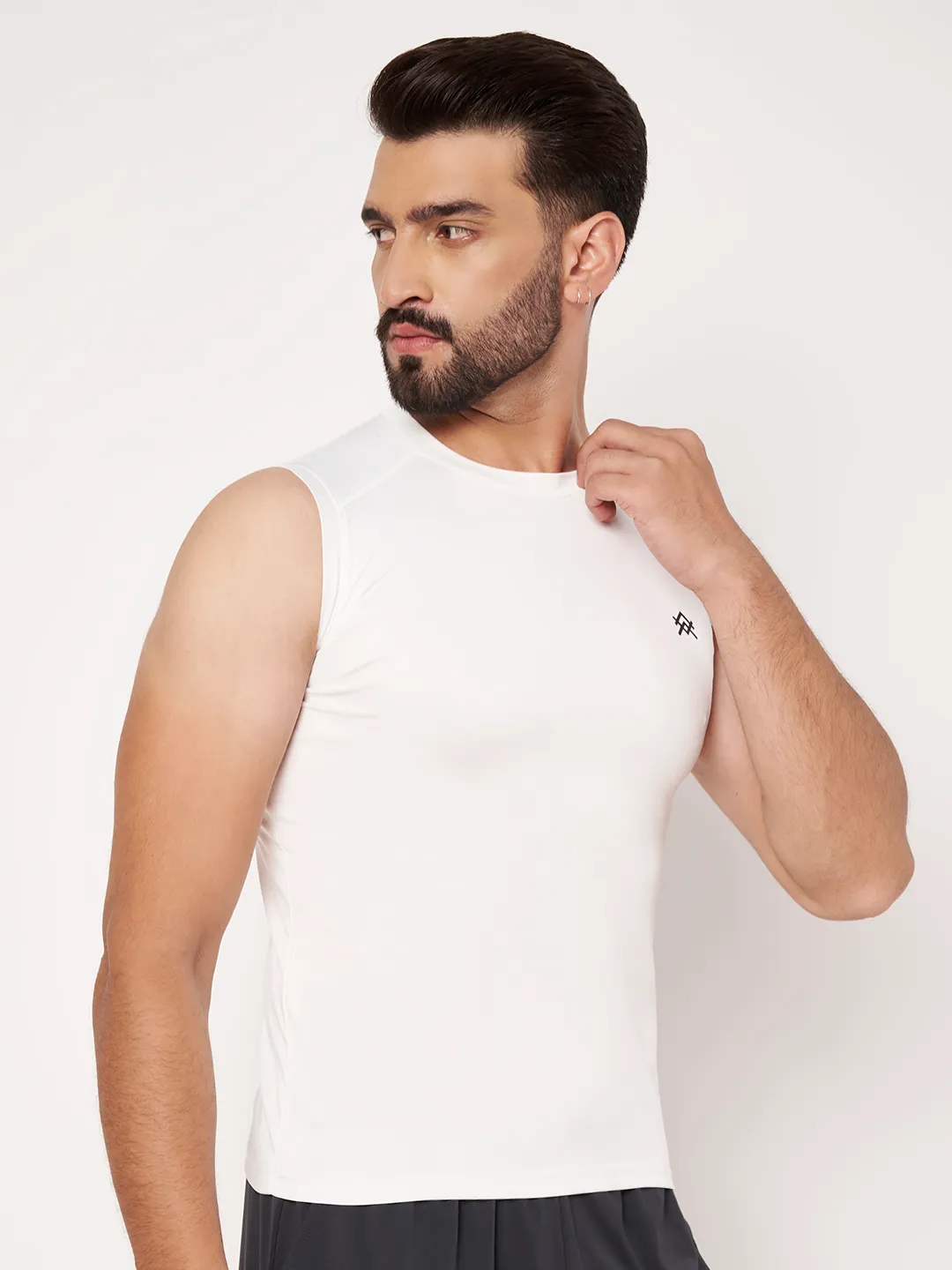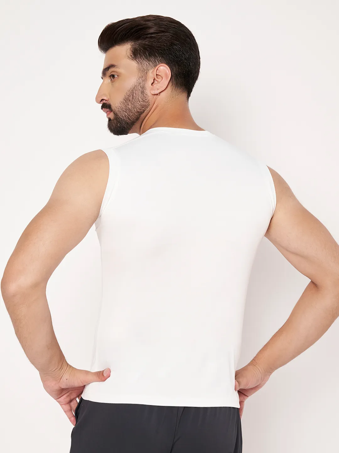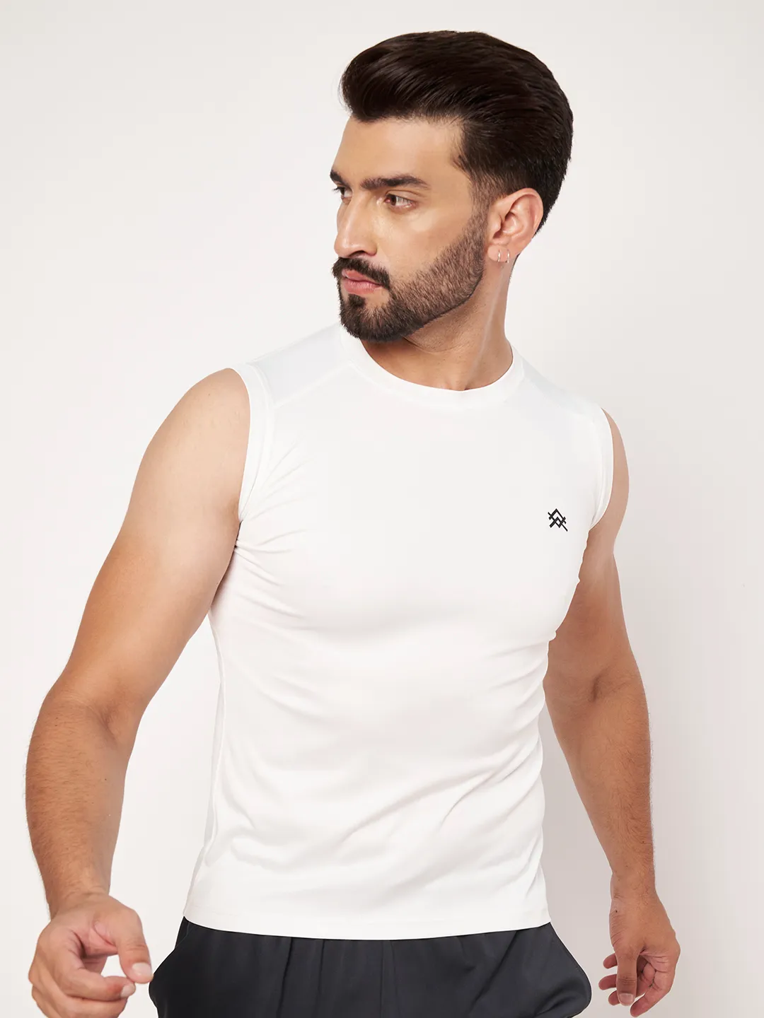 AVA TROIS Men’s Solid White Sleeveless Performance T-Shirt